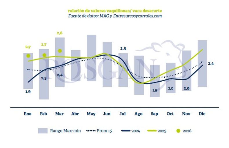 Tomando como referencia los valores promedio del mes de marzo, los precios que paga el mercado por una vaca conserva rondan en torno a los $2.000 por kilo, lo que se traduce en unos $840.000 por cabeza de 400 kg. Por su parte, el valor de una vaquillona con garantía de preñez -aun con una amplia disparidad de valorespuede situarse en un rango medio de entre $2,3 y $2,4 millones por animal. De esta manera, el valor de compra de una vaquillona preñada equivale actualmente al valor de 2,8 vacas de conserva frente a una relación de 2,64 resultante un año atrás.